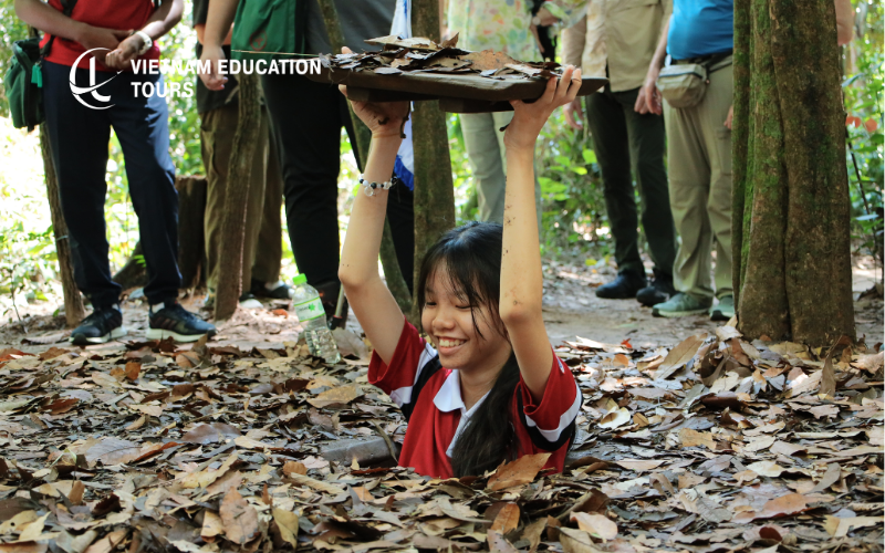This program offers a balanced blend of historical storytelling, cultural exchange, and experiential learning, making it ideal for schools seeking to enrich their curriculum with real-world engagement. At Cu Chi, students can explore preserved underground tunnels, observe wartime artifacts, and listen to guides describe how the tunnels were built and used during the war.