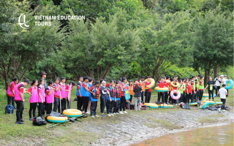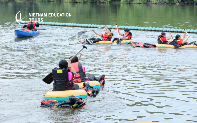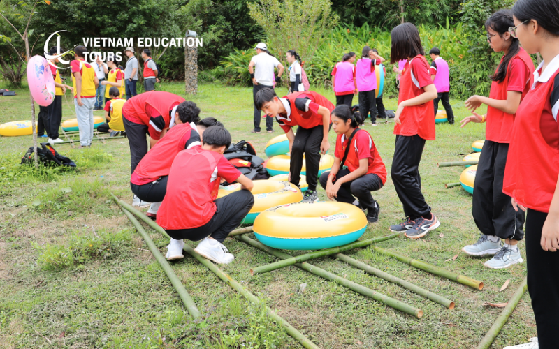 Raft-Building Challenge (Program Highlight): One of the most memorable parts of the Students leadership program in Vietnam. Teams collect materials, design their raft, and work together to build a floating structure. Afterward, they row their rafts across the river to capture a flag. This activity requires planning, teamwork, shared responsibility, and trust, core qualities of effective leadership.